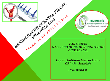 Leer mas...Con el fin de lograr el dialogo sobre la gestión y resultados en el proceso de Rendición de Cuenta de la Contraloría General del Departamento de Sucre, en cumplimiento del artículo 78 de de la Ley 1474 de 2011 y el Conpes 3654 de 2010, artículos 15,16 y 17 de la ley 850 de 2003, de los artícu