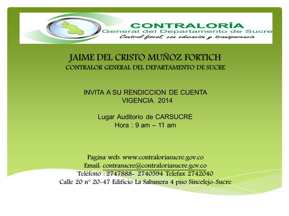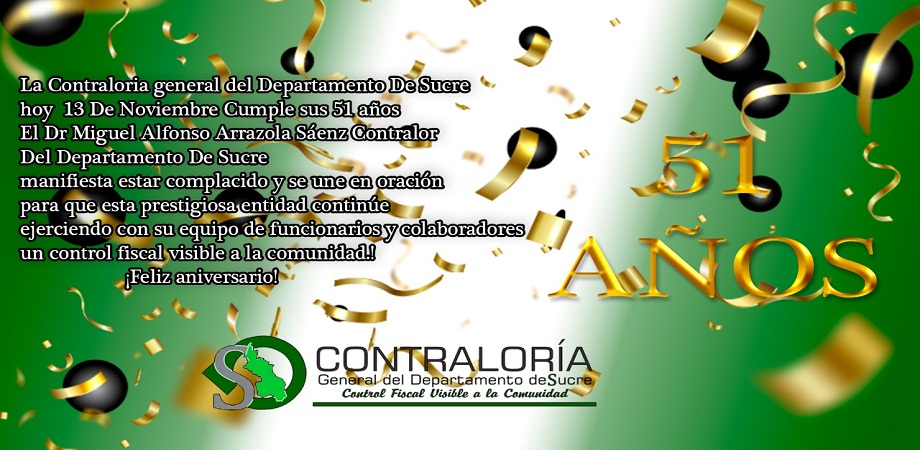 Leer mas...La Contraloría General del Departamento de Sucre, hoy 13 de Noviembre, Cumple sus 51 años. El Dr. Miguel Arrazola Sáenz, Contralor del Departamento de Sucre, manifiesta estar complacido y se une en oración para que esta prestigiosa entidad continúe ejerciendo con su equipo de funcionarios y col