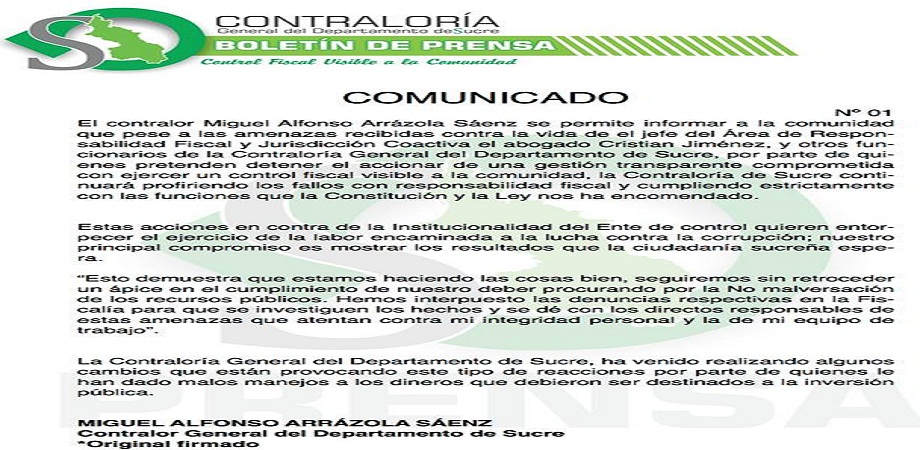 Igualmente se manifiesta para rechazar amenazas de muerte contra el Contralor de Sucre Miguel Arrazola Saenz y su Jefe de Control Fiscal.