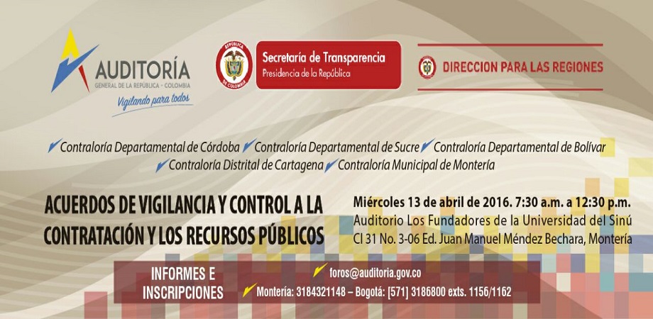 Leer mas...Participamos de las actividades realizadas por la agenda Anticorrupción de la Auditoría General de la República, en este evento que se llevó a cabo en la ciudad de Montería se realizó seguimiento a los acuerdos de vigilancia y control a las contrataciones de los recursos públicos, como temát